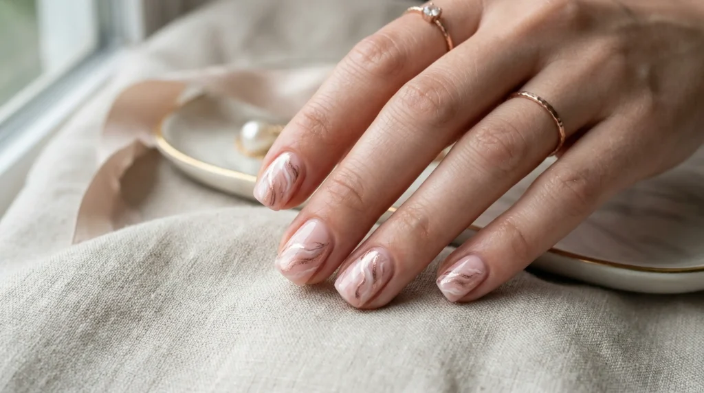9. Rose Gold Marble Flow: Liquid Luxury on Short Nails