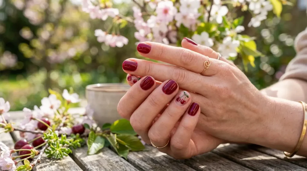 Cherries are everywhere in 2026 and honestly, they’ve earned it. This design uses a deep, glossy cherry red nail polish on most nails with two accent nails showing hand-painted cherries and green stems on a soft nude base. It’s playful, a little retro, and somehow always looks fresh.
