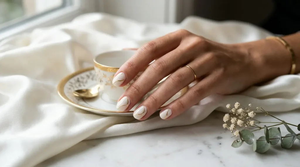 If quiet luxury had a nail look, this would be it. A creamy off-white base, like fine bone china, with gold abstract line nail art drawn lightly across each nail. It’s the kind of elegance that doesn’t try too hard.
