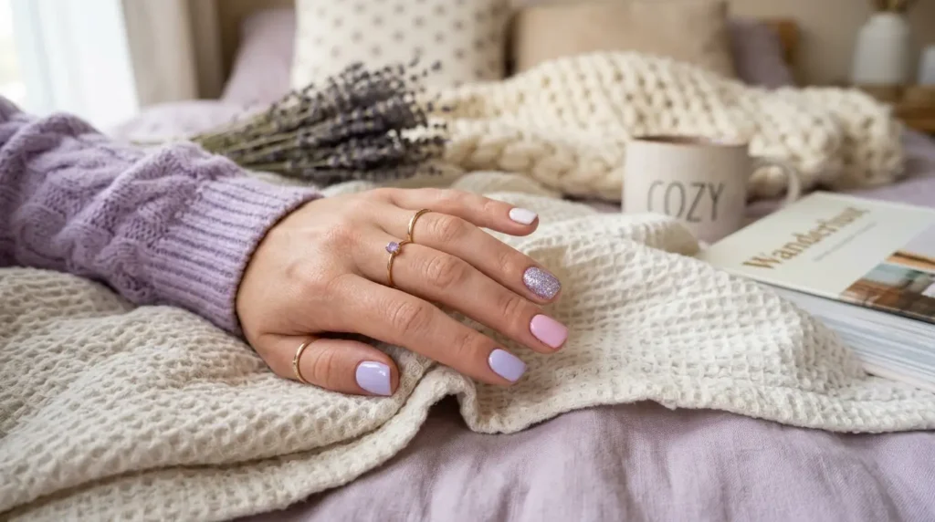 You might be wondering if pastels work on shorter nails. They absolutely do, especially when you break them up with one bold glitter accent nail. That contrast is what makes the whole look feel curated rather than random.