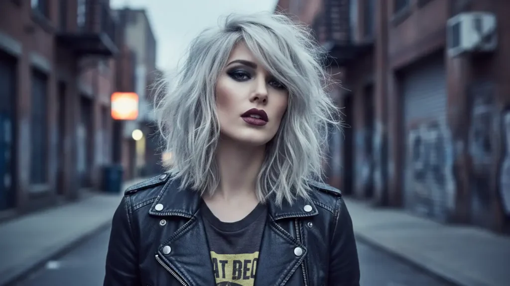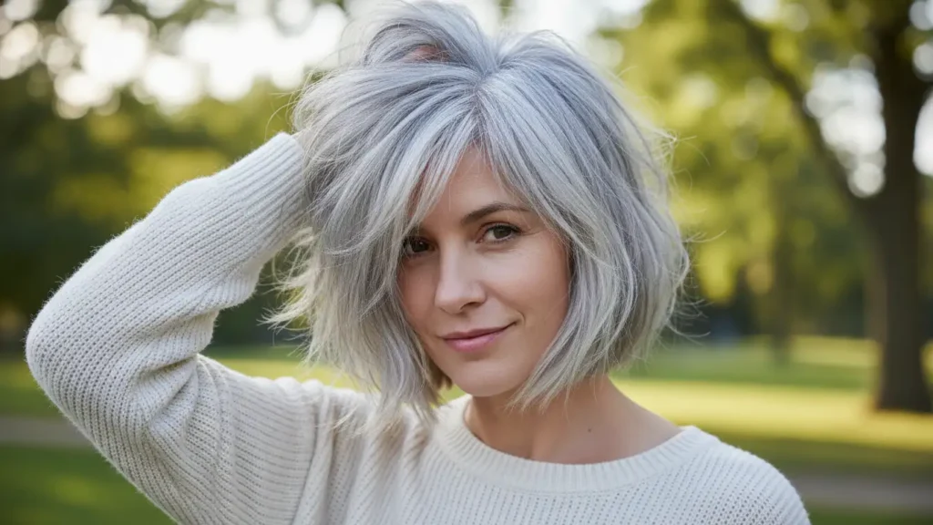 A shaggy bob is all about that lived-in texture and tousled vibe. The layers give it movement, and it works especially well with silver because the different lengths create natural dimension. This is perfect if you like that “I woke up like this” aesthetic.