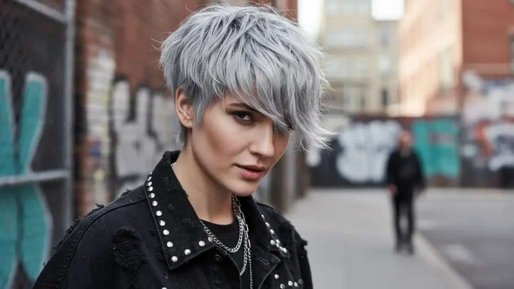 A choppy pixie has irregular, piece-y layers that create texture and movement. It’s edgy without being too severe, and the silver tone adds that modern, fashion-forward element. This is perfect if you want something with personality but still wearable.
