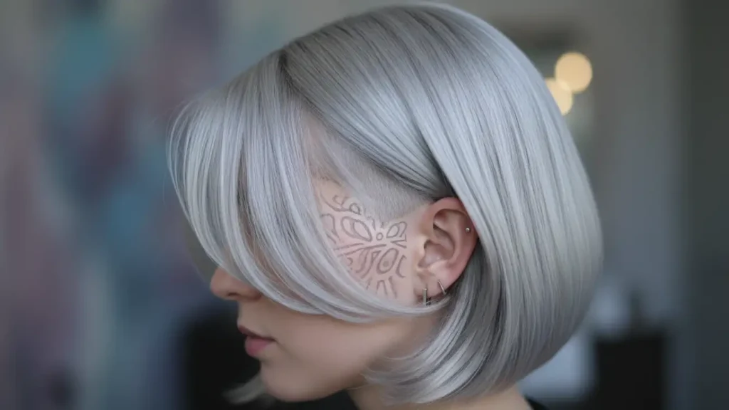 Adding a shaved design to an undercut takes your bob from stylish to artistic. Geometric patterns, lines, or even floral designs create a unique, personalized look. The silver hair makes the design stand out even more.