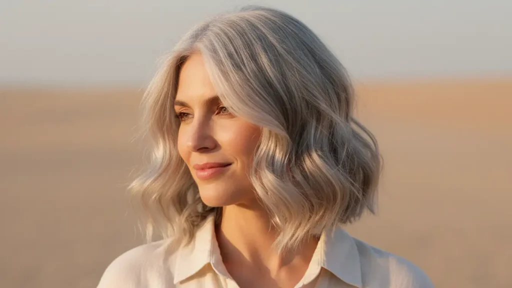 Soft waves add just the right amount of undone texture to a silver bob. It’s that sweet spot between polished and effortless—like you spent time on it, but not too much time. The waves catch light differently, making the silver look multidimensional.