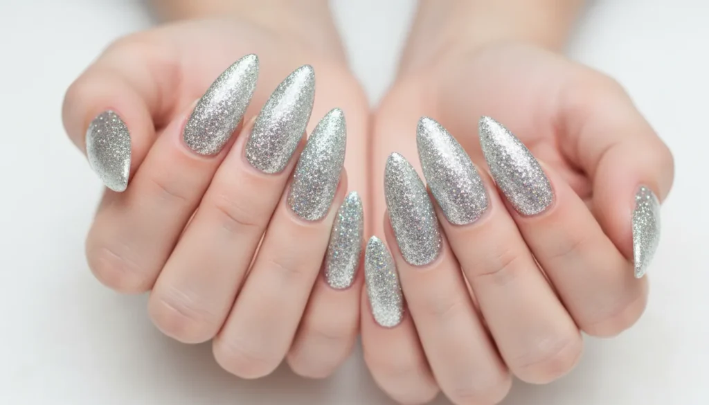 Sometimes you just want maximum sparkle, and that’s exactly what full silver glitter nails deliver.