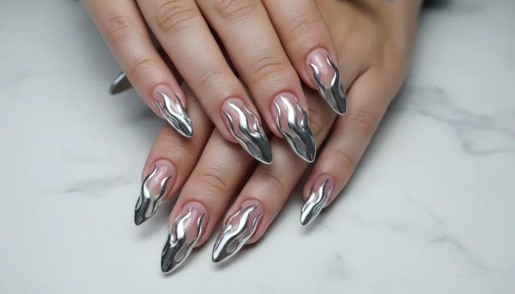This design features flame-shaped patterns at your nail tips, usually in silver chrome against a nude or clear base. It’s edgy without being aggressive, artistic without being too abstract.