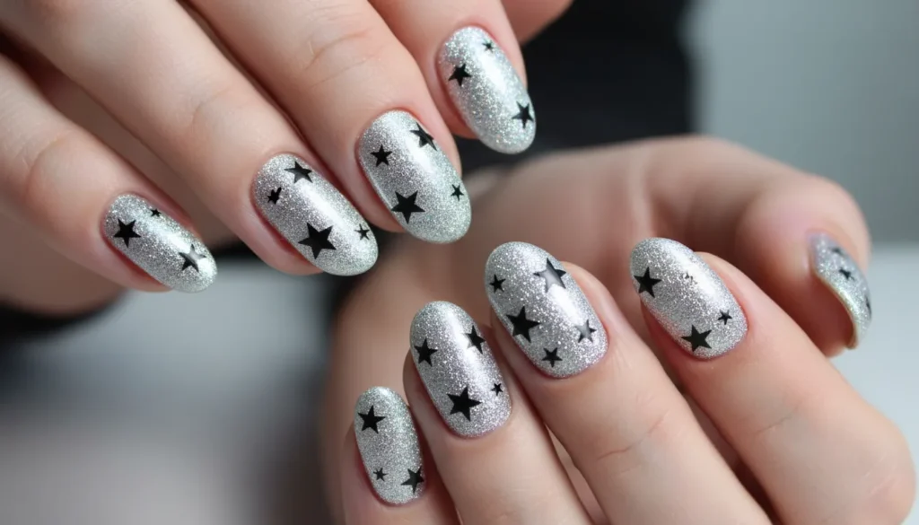 Instead of concentrating the design at the tips, this silver nail idea features all-over silver shimmer with tiny black stars scattered across the nails. The contrast between the bright silver and dark stars creates visual interest without being overwhelming.