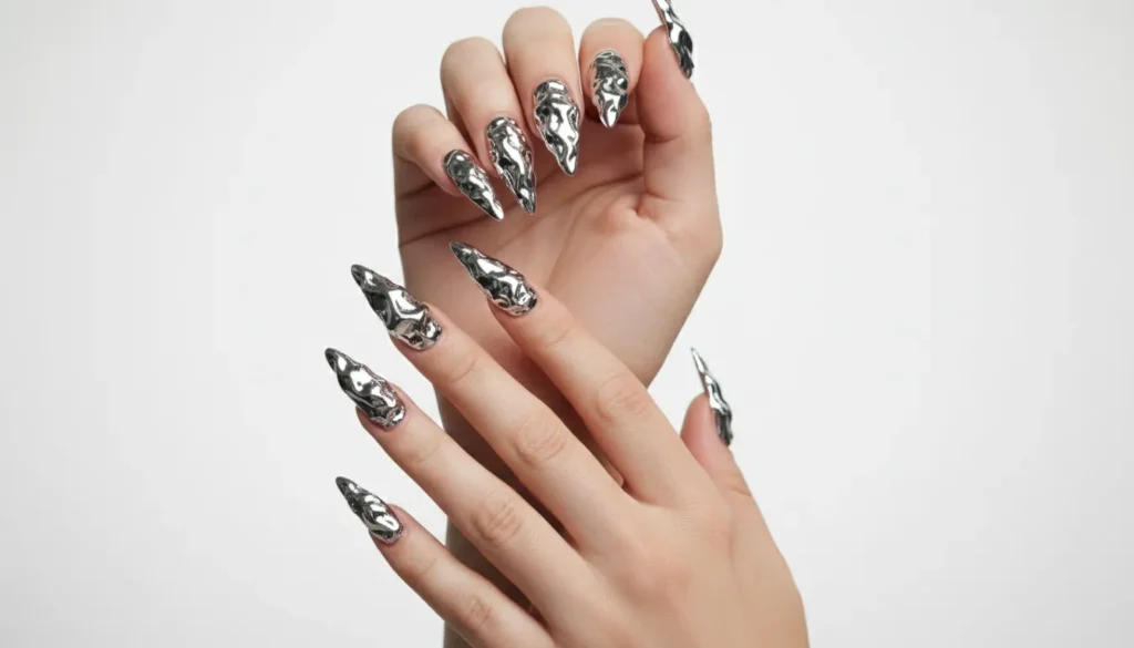 Now we’re getting into statement territory. If you’ve been following nail trends on social media, you’ve definitely seen these raised, sculptural silver nails popping up everywhere.
