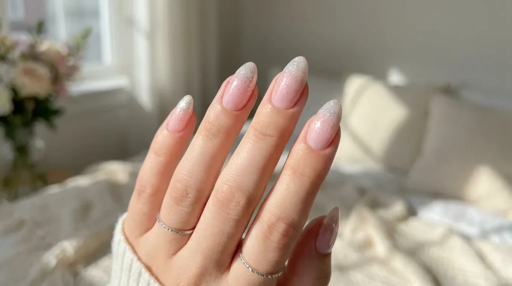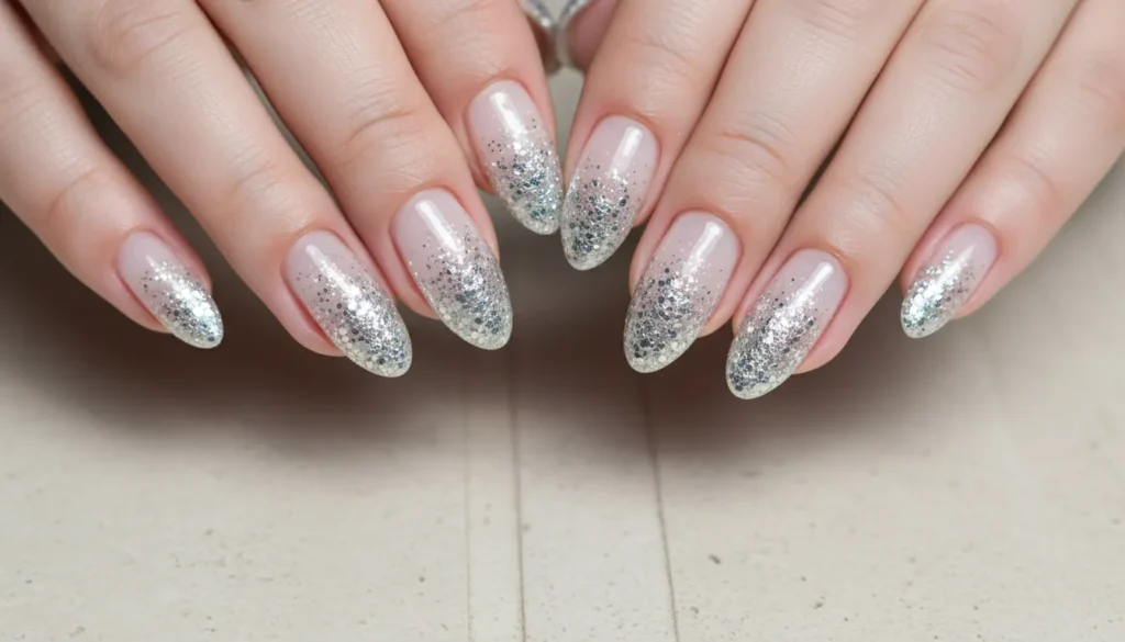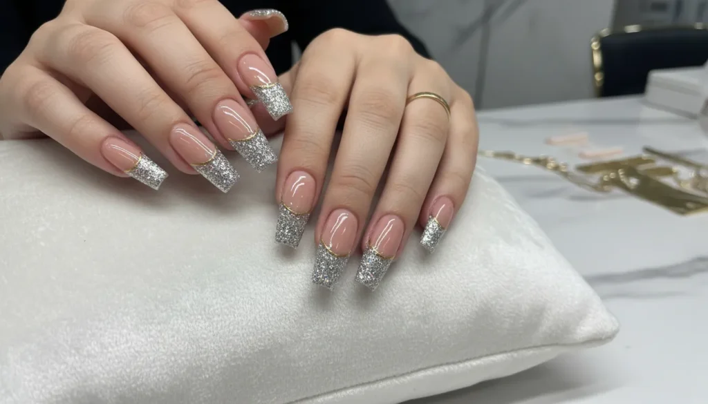 This design combines a soft, milky white or nude base with silver glitter applied either all over or concentrated at the tips. The result is sparkly without being tacky, festive without screaming “it’s party time.”