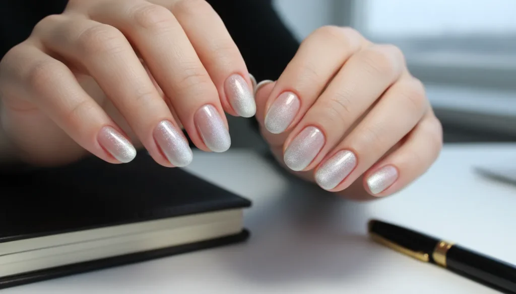 A silver shimmer fade is incredibly subtle—just a whisper of metallic sparkle that gradually intensifies toward the tips or remains evenly distributed across the nail. It’s the “no-makeup makeup” equivalent of nail designs.