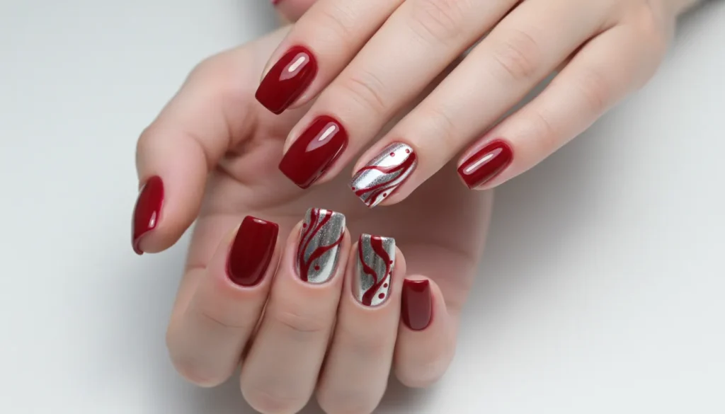 This design might feature mostly silver nails with one or two accent nails in deep red, or it could be red nails with silver details and embellishments. The combination is striking—warm red against cool silver creates this dynamic tension that’s really eye-catching.