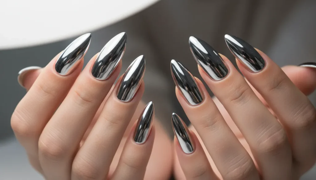 Professional nail artists have been talking about this effect for years. The metallic finish catches light in a way that draws attention to your hands in the best possible way. It’s not flashy or over-the-top, just… elevated.