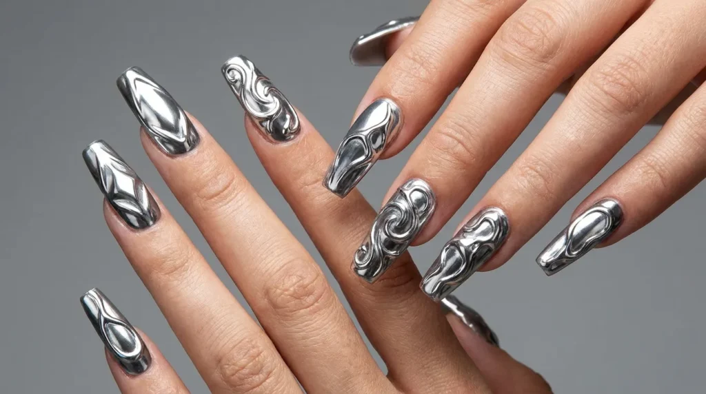 This design features chrome silver with dimensional elements—think raised patterns, textured surfaces, or actual 3D designs that stick up from the nail. It’s basically wearable art on your fingertips.
