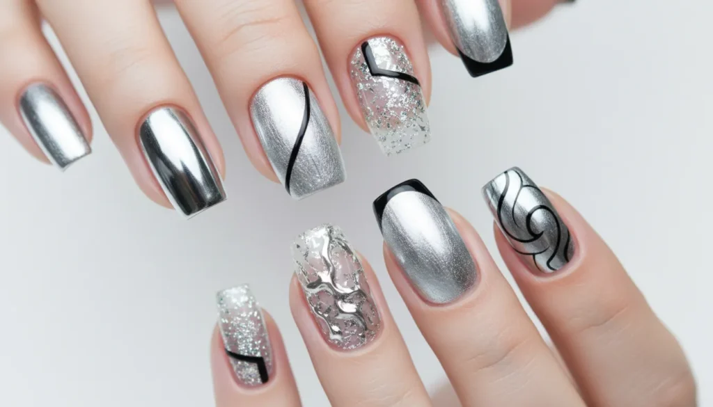 This design combines different chrome finishes and textures across your nails—maybe some full silver chrome, some with black accents, some with clear jelly polish, all working together to create a cohesive but varied look.