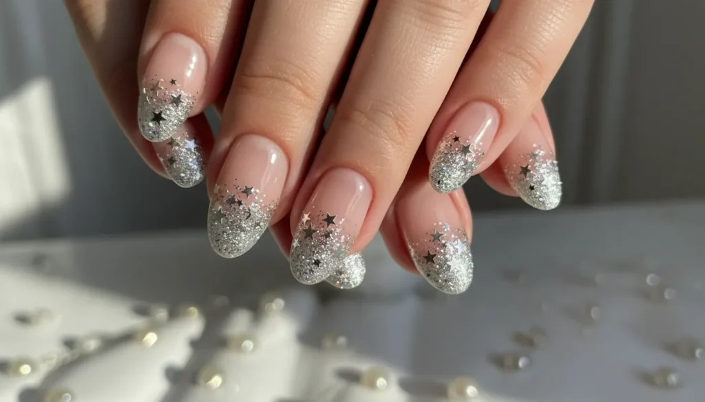 This design features silver glitter concentrated at the tips (usually in a French tip style) with tiny star details added for extra sparkle and whimsy. It’s celebratory without being costume-y.