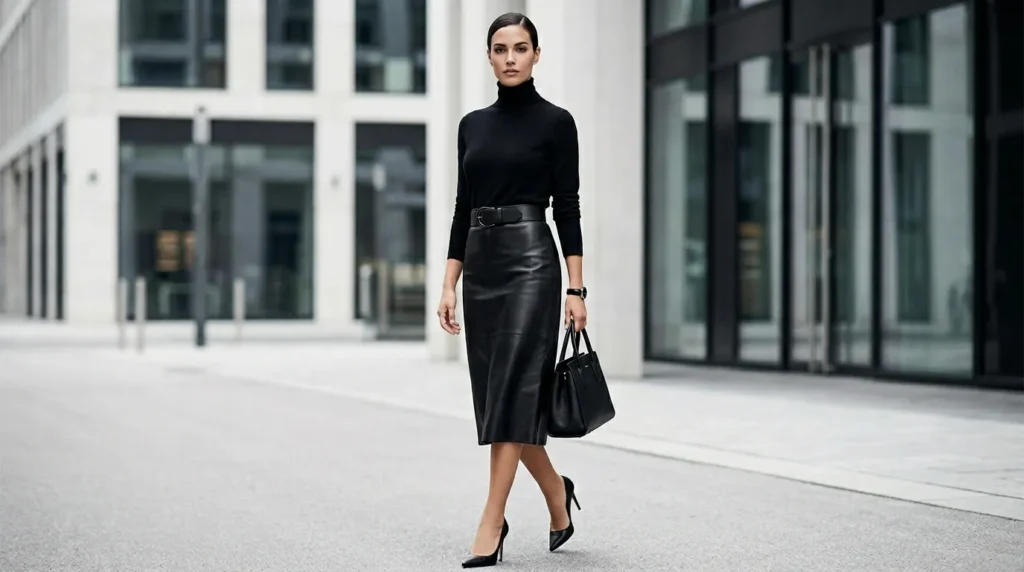 | All-Black Confidence | Leather midi | Black turtleneck, wide belt | Power dressing |