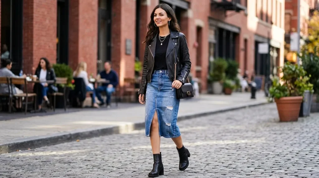 Key pieces: Denim midi skirt, leather jacket, ankle boots, small shoulder bag.