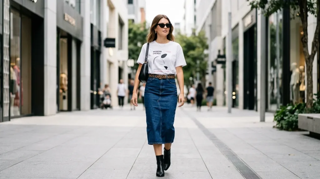 Denim skirts in 2026 are not what you remember from the early 2000s. A high-waisted denim midi skirt with a flattering fit paired with a graphic white tee is the perfect balance of relaxed and refined.