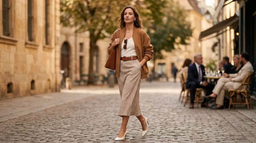 There’s something quietly luxurious about a well-done earth-tone outfit. A printed brown and cream midi skirt with a ribbed white tank and a camel bomber jacket is warm, grounded, and genuinely beautiful.