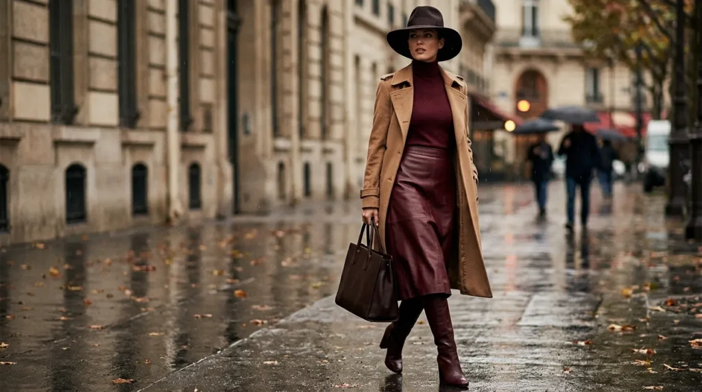 Key pieces: Burgundy leather skirt, wine-red turtleneck, camel trench coat, high boots, wide-brimmed hat, structured tote.