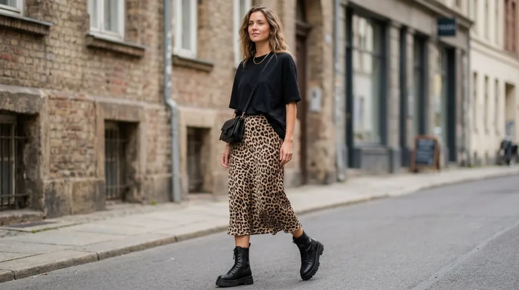 | Effortless Urban Leopard | Leopard midi | Oversized tee, chunky boots | Errands, brunch |