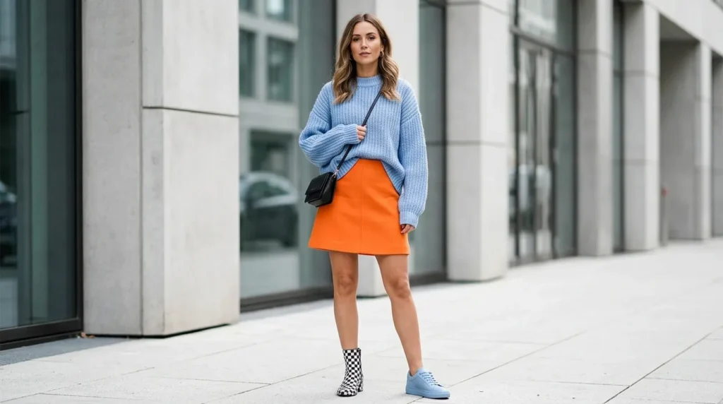 Who says minimalism has to mean neutral? An orange mini skirt with a powder blue oversized sweater and matching blue shoes is proof that color can be sophisticated when it’s handled with intention.
