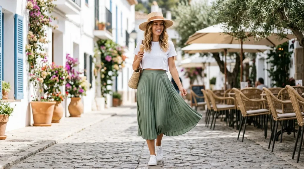 If there’s one look that captures the spirit of 2026 summer fashion, it’s this one. A sage green pleated skirt with a white crop top is light, bright, and full of good energy.