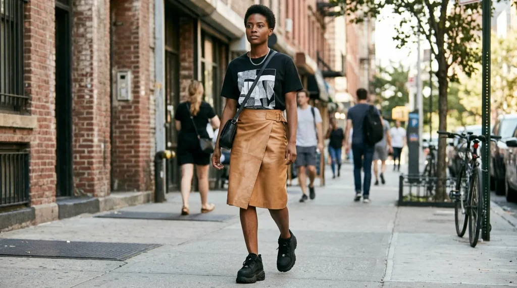 A tan leather wrap skirt with a graphic black tee is the kind of combination that communicates style without trying to be flashy about it. The cut gives it a slight edge. The neutral palette keeps it wearable. The heavy black sneakers make it practical without sacrificing any of the appeal.