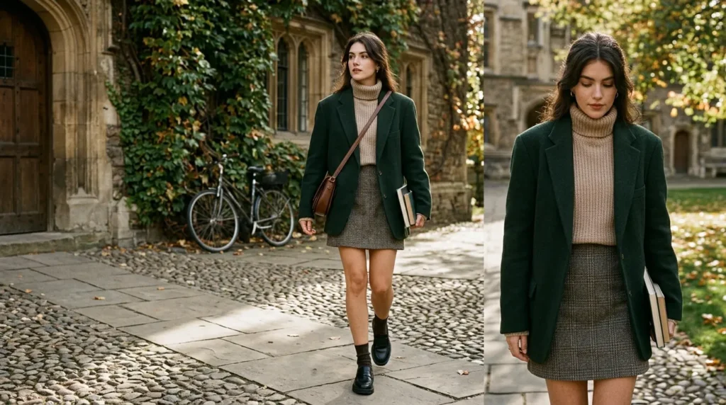 | Timeless Academic Chic | Tweed mini | Blazer, loafers, crossbody | Classes, coffee dates |