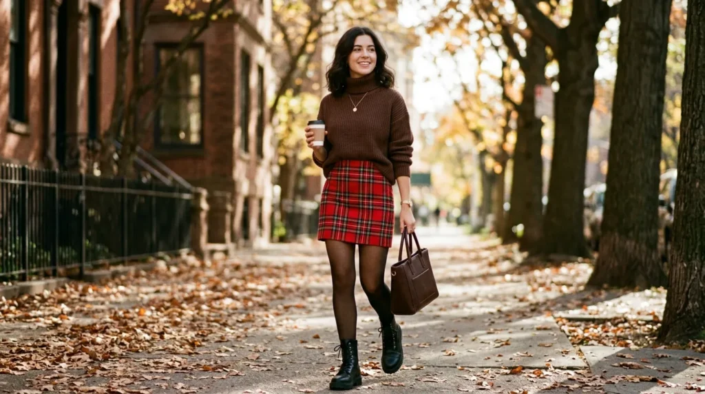 Now here’s where it gets interesting — plaid is back, but it’s grown up. A red tartan mini skirt worn high-waisted with a chocolate-brown turtleneck sweater is one of those combinations that just feels right for the season.