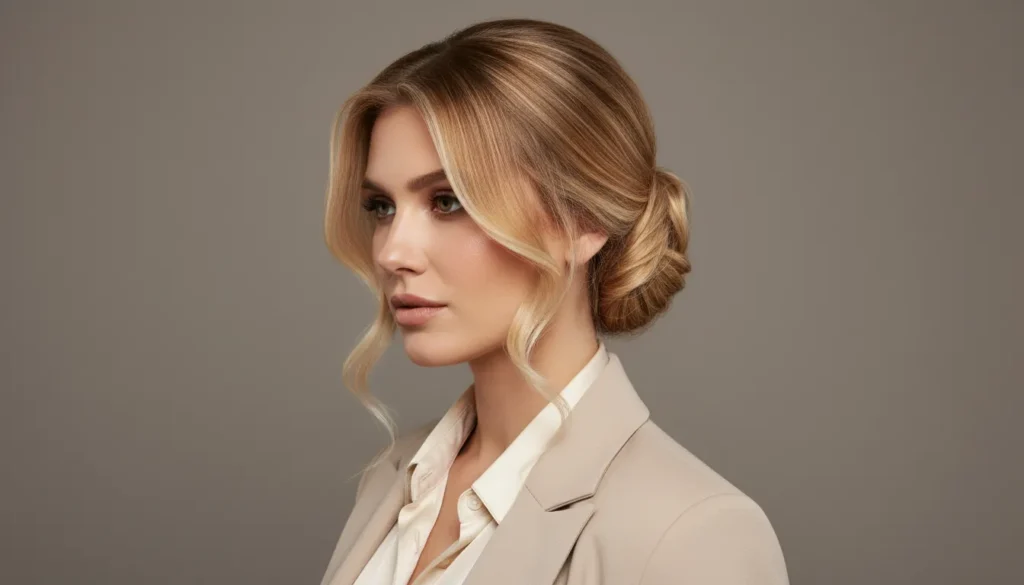 Blonde balayage tones look extra refined when styled into updos. Face-framing pieces stay light and bright, giving the whole look a clean, put-together feel.