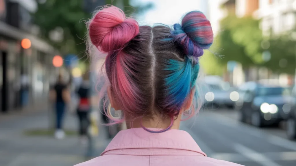 Feeling bold? Space buns with temporary color are festival-ready and commitment-free. Use temporary hair chalk or spray-on color before creating your buns.