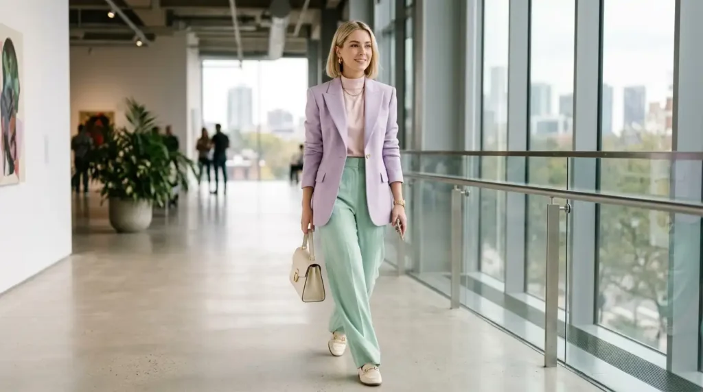 | Pastel Blue / Blush | Matching tonal trousers | Approachable, soft power | Pastel blazer office spring |