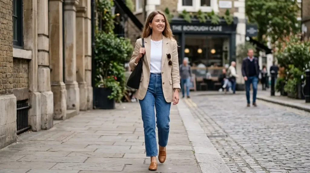 This is the one that broke the “denim isn’t office-appropriate” rule for good. A beige or camel blazer over straight-leg jeans and a simple top hits the sweet spot between professional and relaxed. It’s the outfit I’d wear to a casual client coffee or a creative brainstorm.