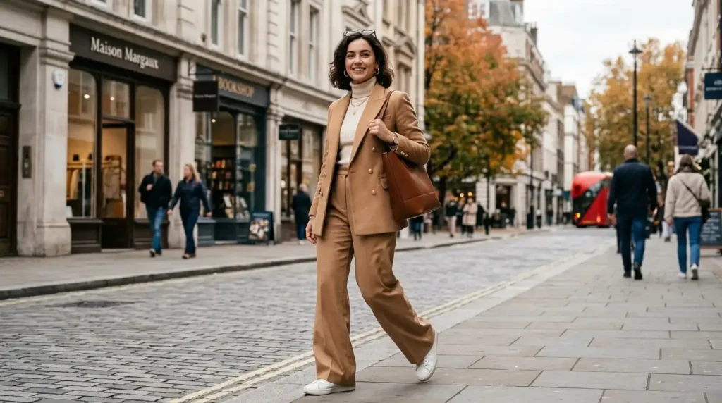 Now here’s where it gets interesting. Wide-leg trousers paired with a camel blazer is the 2026 answer to “I want to look put-together but I also need to walk fast and think clearly.” The proportions do everything. The blazer is fitted enough to anchor the wide hem, and the whole look flows in a way that makes you move differently — more deliberately, more confidently.