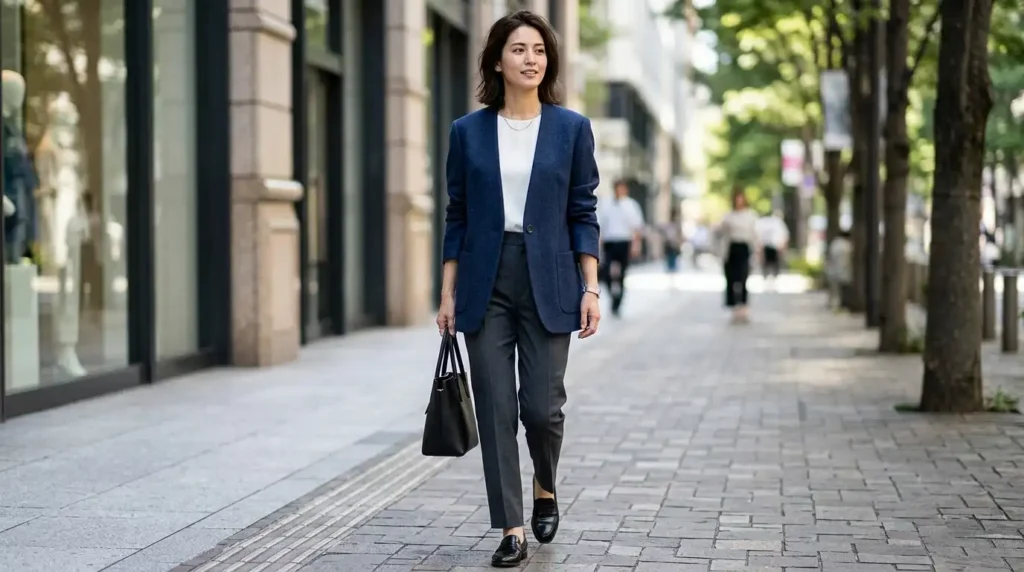 Step 4: Pick shoes that match the formality level. Loafers or pointed-toe flats for professional. Clean sneakers for creative or casual offices. Block heels or mules when you need extra authority.
