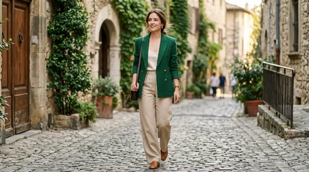 Green blazers — especially sage, olive, and muted emerald — have become the smartest color choice for spring 2026. They read as fresh and grounded at the same time, which is rare. Paired with a striped top and light beige trousers, this is an outfit that sparks genuine conversation without feeling try-hard.
