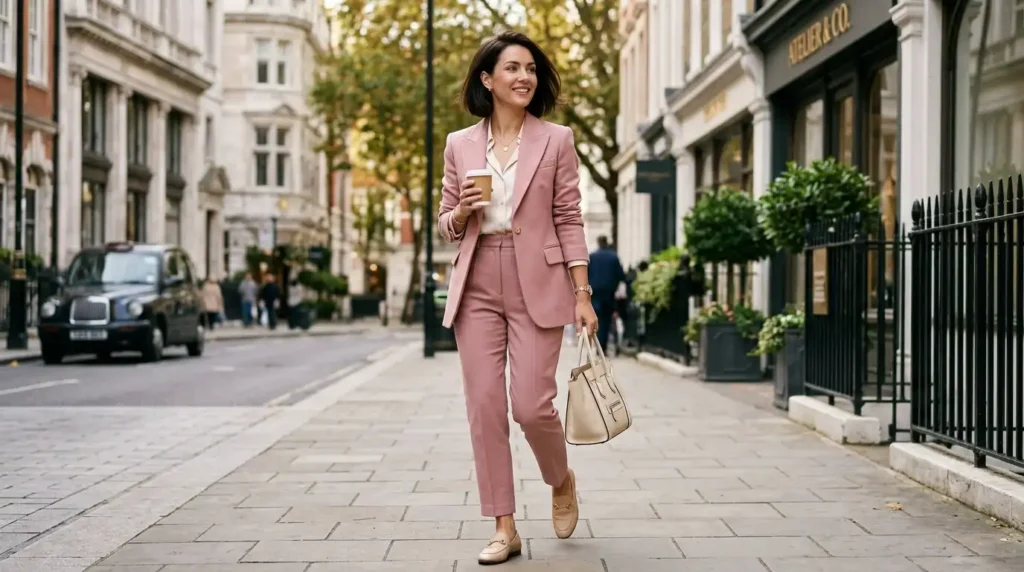 | Dusty Pink / Blush | Black trousers, cream | Graphic, modern, strong contrast | Pink blazer workwear 2026 |