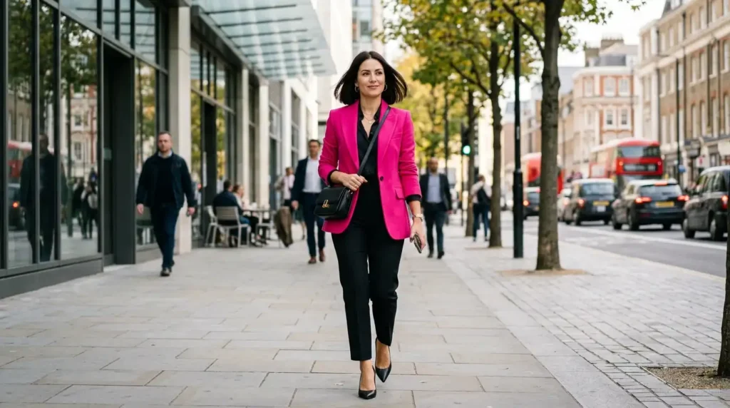 Pink Blazer + Black Tailored Trousers (The Graphic Contrast Formula)