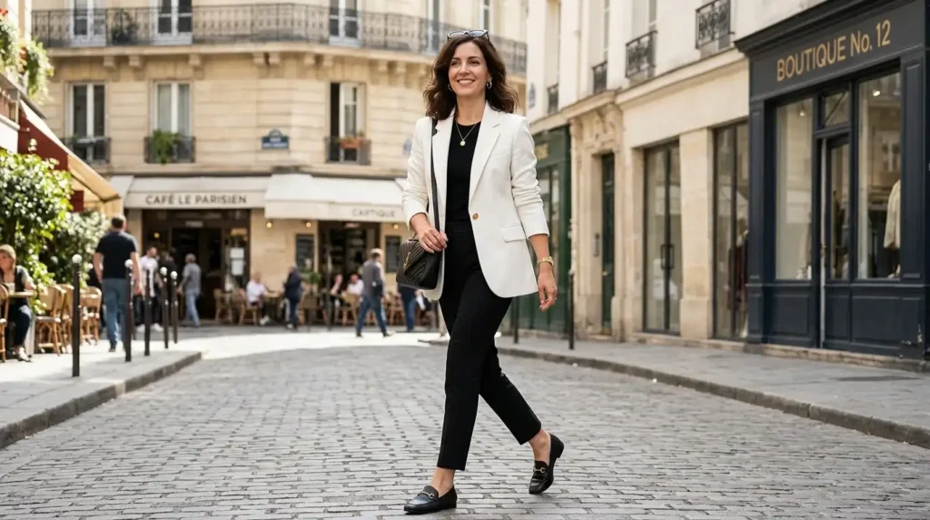 You might be wondering how something this simple can feel so right. The answer is in the fit. A crisp white blazer in a slightly relaxed cut over slim dark trousers is the ultimate modern work uniform. It’s the first outfit I reach for when I need clarity — there’s something about white tailoring that feels like a fresh start, even on a stressful Wednesday.