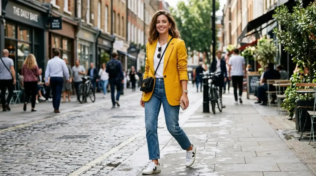 You don’t have to wear color to work. But on the days when you choose to, a saturated yellow or cobalt blue blazer paired with simple neutral denim creates one of the most quietly powerful looks of the season. The key is keeping everything else completely calm — plain top, understated accessories, clean shoes.