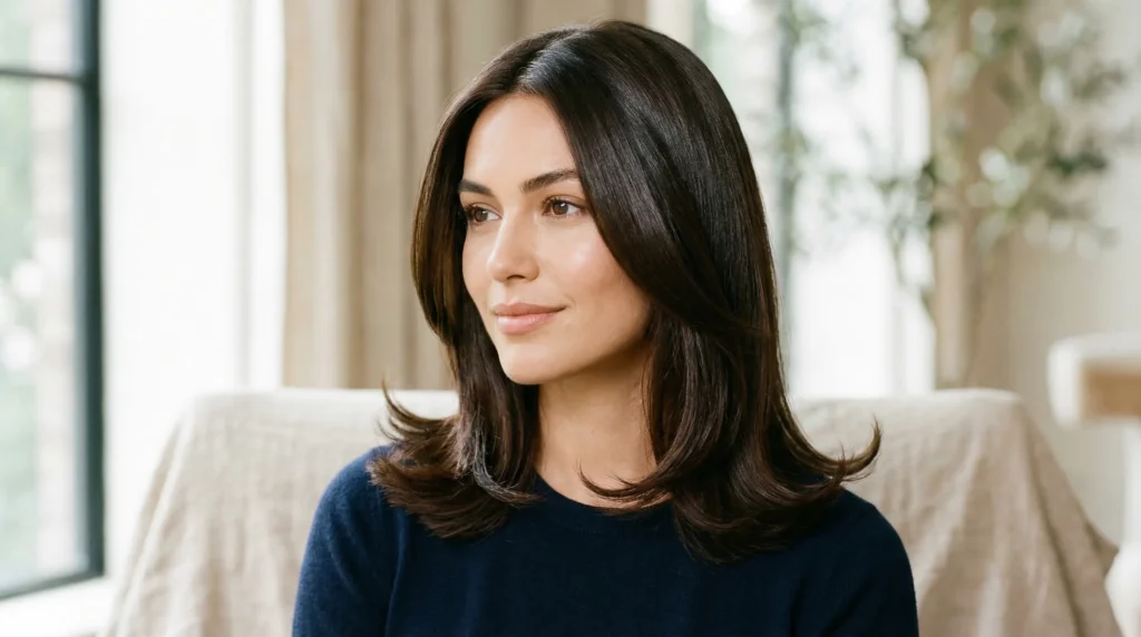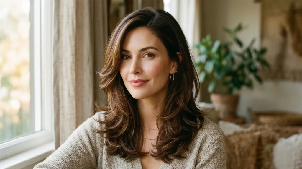 This layered brunette style embraces a deep side part and feathered ends that fall softly around the shoulders. The cut isn’t dramatic, but the shaping around the face gives it real elegance and subtle drama. It’s a more refined interpretation of mid length layered haircuts, where the emphasis is on flow and balance rather than volume or statement color.