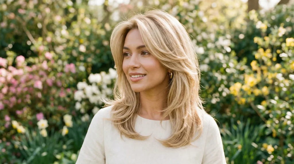 This is where spring truly blooms in a haircut. Voluminous, shoulder-grazing layered blonde hair combined with creamy tones feels fresh, luminous, and completely aligned with 2026 energy. The layering starts around the cheekbones and cascades down, creating fullness through the ends without thinning them. This is particularly brilliant for fine hair that needs body without sacrificing length.