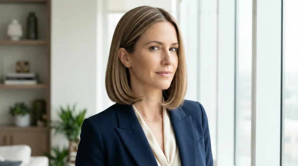 The beige-bronde coloring is what makes this feel so modern. Fine, seamless highlights blended into a neutral base that reflect light softly rather than announcing themselves. It looks executive and feminine at the same time, which is a combination that’s harder to pull off than most people realize.