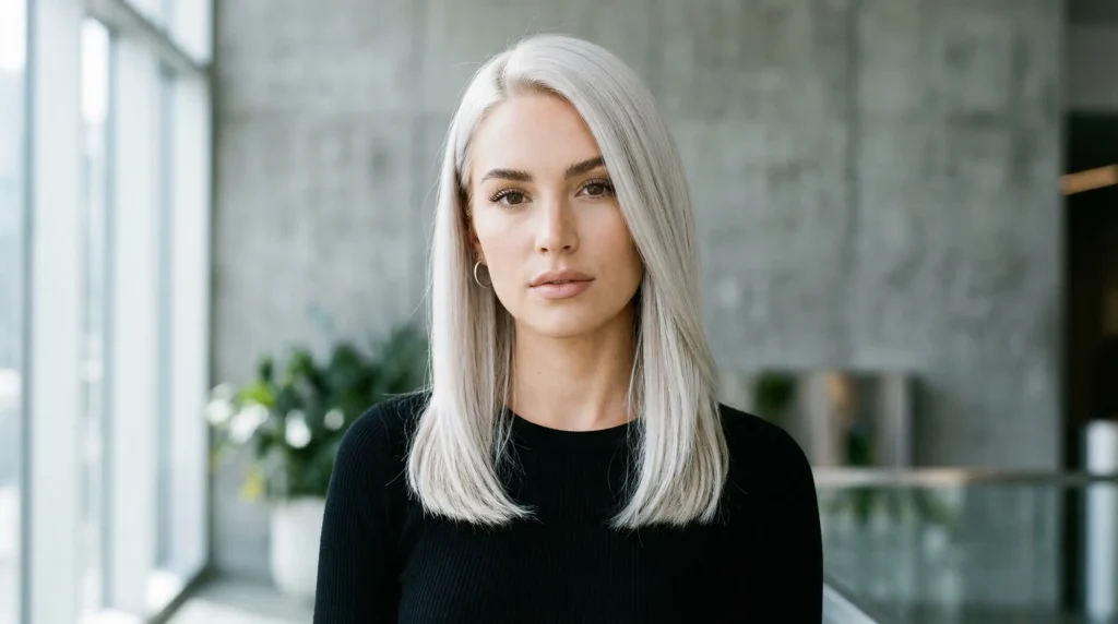 If you’re ready to commit to real brightness, this cool platinum mid-length cut makes a statement without feeling aggressive. The length sits just below the shoulders with clean, elongated layers that taper softly toward the ends. The icy, almost porcelain blonde tone is crisp but still dimensional, which stops it from looking flat or one-note.