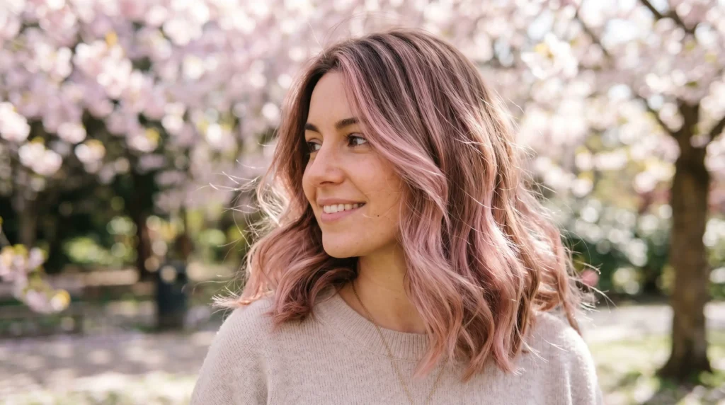Muted rosy ribbons melted through a natural medium brunette base — this is spring to summer hair color at its most delicate. The pink tones shift between warm blush and dusty rose depending on the light, catching attention without announcing themselves. It’s the color equivalent of early spring blossoms: feminine, modern, barely-there.