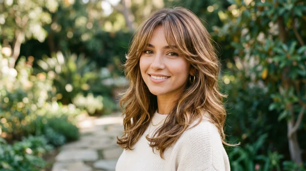 Warm honey highlights combined with a medium brunette base — this honey highlights blend creates a natural glow that works beautifully with layered styling. The soft curtain bangs frame the face while long layers fall into gentle waves that enhance the dimensional tones. Probably the most universally flattering color on this list.