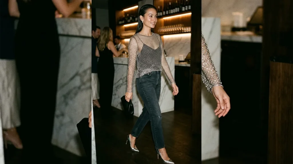 8Crystal Sheer MagicBeaded sheer top, straight denim, metallic heelsCasual glam night outEffortless glow