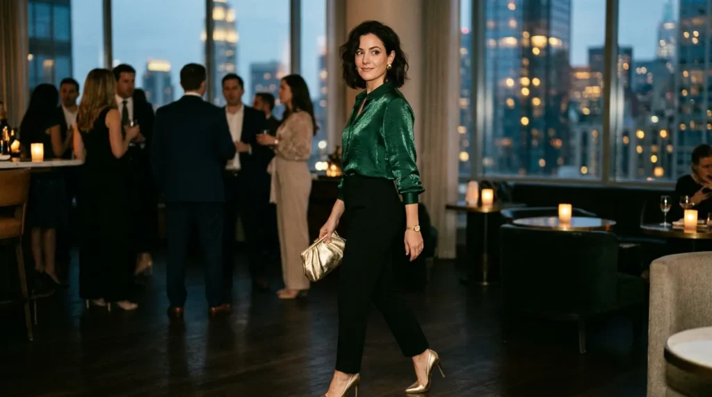 12Emerald Hour GlamGreen metallic blouse, black trousers, structured clutchCocktail party, late dinnerJewel-toned drama
