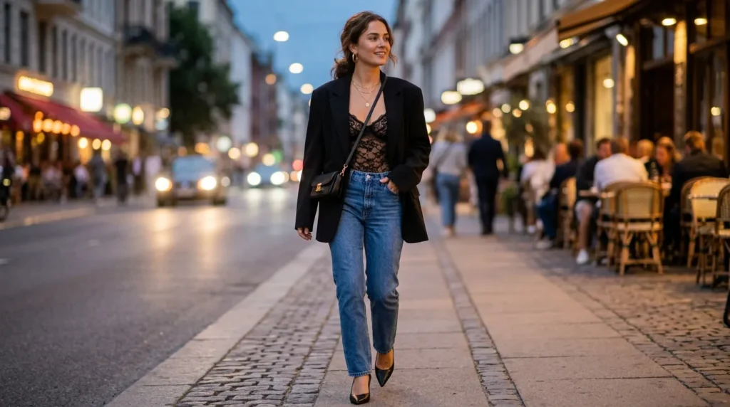 Lace and denim is one of those combinations that shouldn’t work on paper — and yet it always does. The soft texture of a lace bodysuit against structured straight jeans creates a visual tension that’s genuinely appealing. The oversized blazer on top adds confidence and makes the whole thing feel completely intentional rather than accidental.